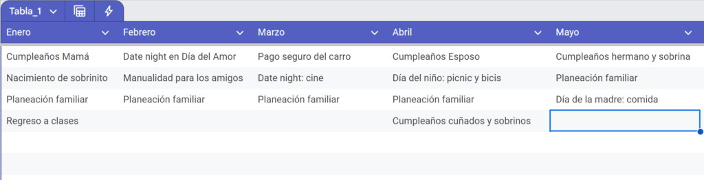 4. Ahora lo que vas a agregar en tu listado de fechas son las actividades, hábitos y proyectos, anota cuándo empezarías, cuándo terminarías etc.